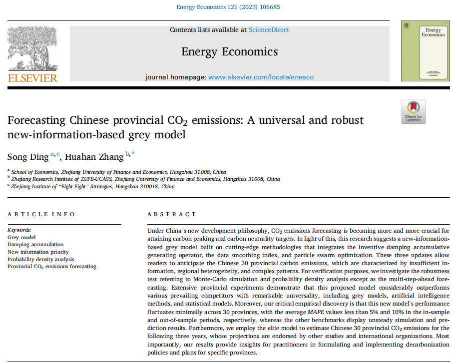 研究生学科交叉研究项目的资助。Song Ding, Huahan Zhang, 2023. Forecasting Chinese provincial CO2 emissions: A universal and robust new-information-based grey model. Energy Econ, 121, 106685.