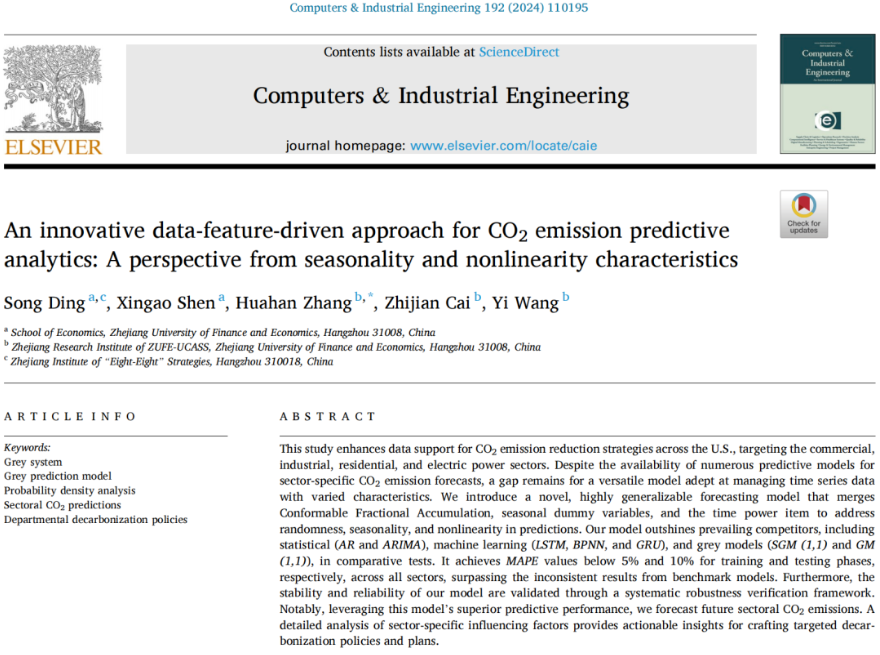 丁松老师的合作文章《An innovative data-feature-driven approach for CO2emission predictive analytics: A perspective from seasonality and nonlinearity characteristics》在期刊《Computers & Industrial Engineering》2024年第6期发表。该文章研究了美国分部门碳排放的数据特征,并通过数据特征驱动的方法,预测具有随机性、非线性和季节性特征的碳排放时间序列,为未来部门层面的 CO2减排治理提供数据支持和政策建议。