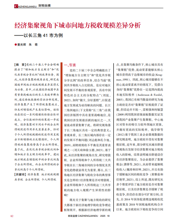 2022级税务专业研究生朱萌同学与导师童光辉教授合作的文章《经济集聚视角下城市间地方税收规模差异分析——以长三角41市为例》在《财政监督》2025年第18期发表。文章以长三角41市为研究对象,探讨经济集聚对城市间地方税收规模差异的影响机制,为优化共享税分享比例、增强地方自主财力的财税体制改革提供实证支撑和政策启示。