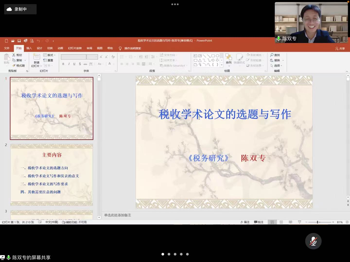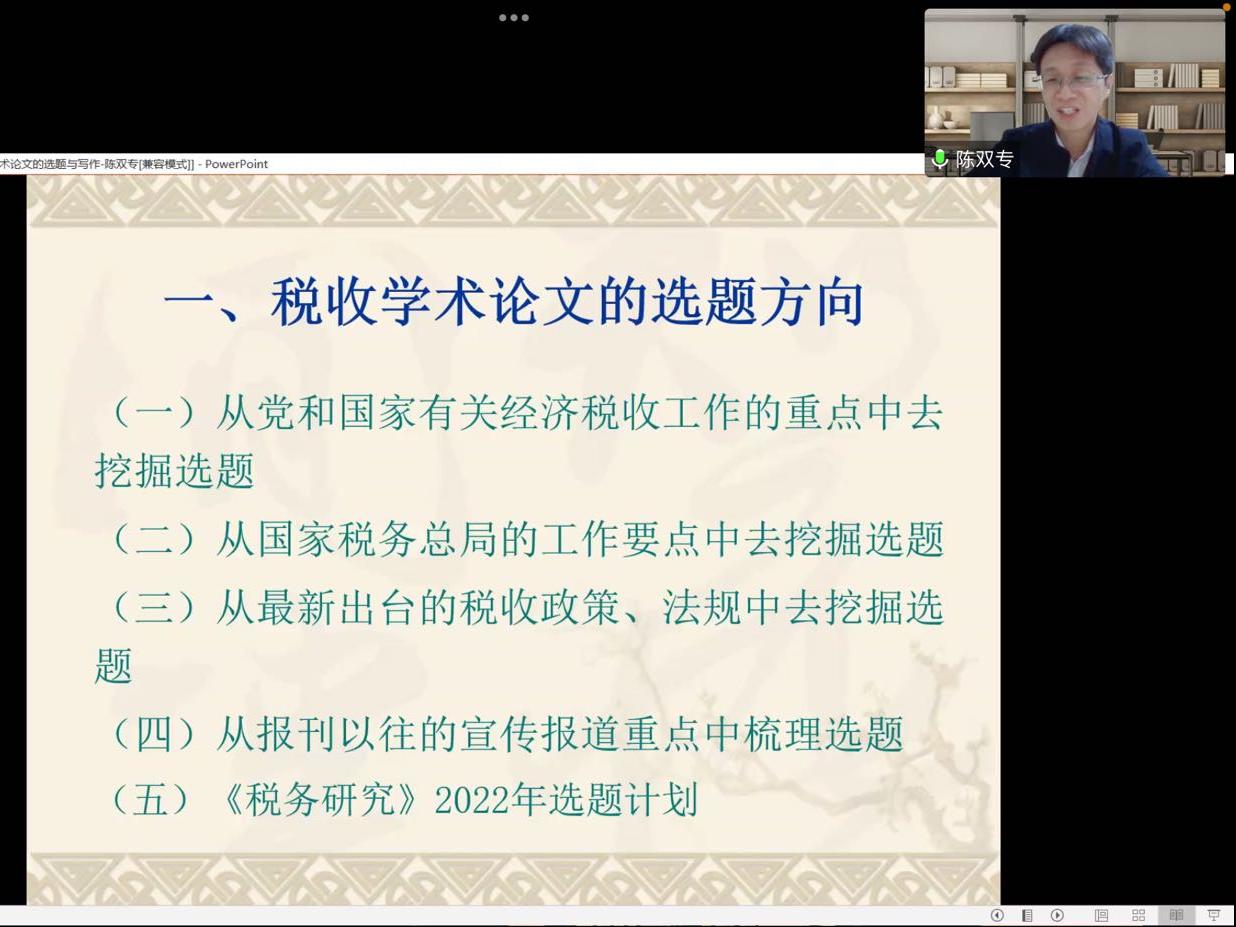 3月23日晚,《税务研究》杂志编辑部副主任(主持工作)陈双专编审应邀分享了主题为“税收学术论文的选题与写作”的讲座。本次讲座由博彩导航