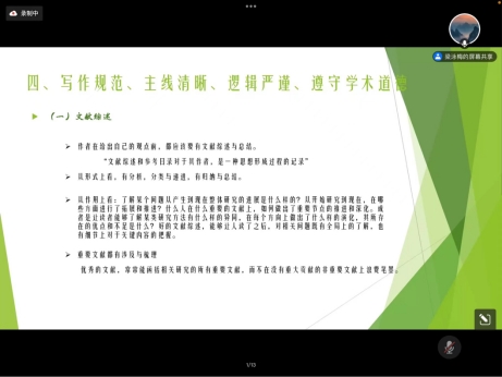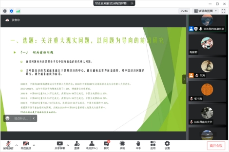 梁泳梅副研究员以自身多年的编辑、审稿经验为例,对编辑工作进行了深入细致的讲解。从论文选题方向、研究方法、文献综述、学术道德、发刊要求等多方面来介绍一篇优秀的经济学类论文撰写过程中可能存在的问题以及编辑人员重点关注的“创新性➕研究方法”的遴选原则与要求。最后,倪建伟教授对本次讲座的主要内容进行了总结,梁泳梅副研究员针对本次讲座过程中提出的问题进行了详尽细致的解答。