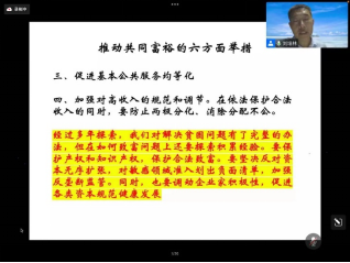刘副院长首先以习近平总书记关于共同富裕的阐述为基准,同时结合自身对共同富裕的理解向大家阐述了共同富裕的内涵;其次,刘副院长点明了促进共同富裕要把握好“量力而行”、“循序渐进”等基本原则并解释了推动共同富裕的六大举措与实现路径。最后洪兴建教授对本次讲座内容进行了凝练,点明了共同富裕的价值。