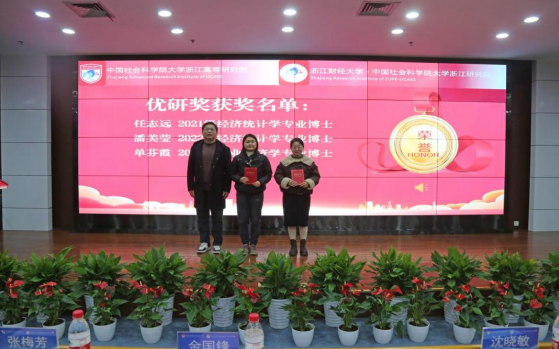 )相关领导为专项奖学金获奖学生颁发荣誉证书,江奕娴、俞晓鹏分别作为专项奖学金获奖学生代表、浙研院春学期赴京访学学生代表发言。