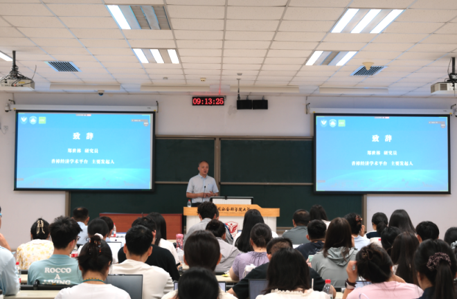数量经济与技术经济研究所郑世林研究员发表致辞。首先,郑世林研究员回顾了香樟经济学术圈的发展历程,用轻松活泼的语调勾勒出了“香樟经济学术圈”的“来时路”。其次,郑世林研究员介绍了平台秉持的“分享、低调、创新”学术理念。最后,郑世林研究员希望每位“香樟小青苗”都能够在高质量学术讲座中有所思、有所获,以开放的心态潜心做学术研究,未来能成长为独当一面的优秀学者,为中国经济学研究贡献智慧与力量。