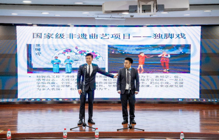 侯圣霖、洪崇乔两位传承人带来独脚戏展示。两人紧扣当下青年生活痛点,以诙谐幽默的方式聚焦“合理使用手机”这一主题,一个个贴合校园生活的包袱逗得学生们捧腹大笑。